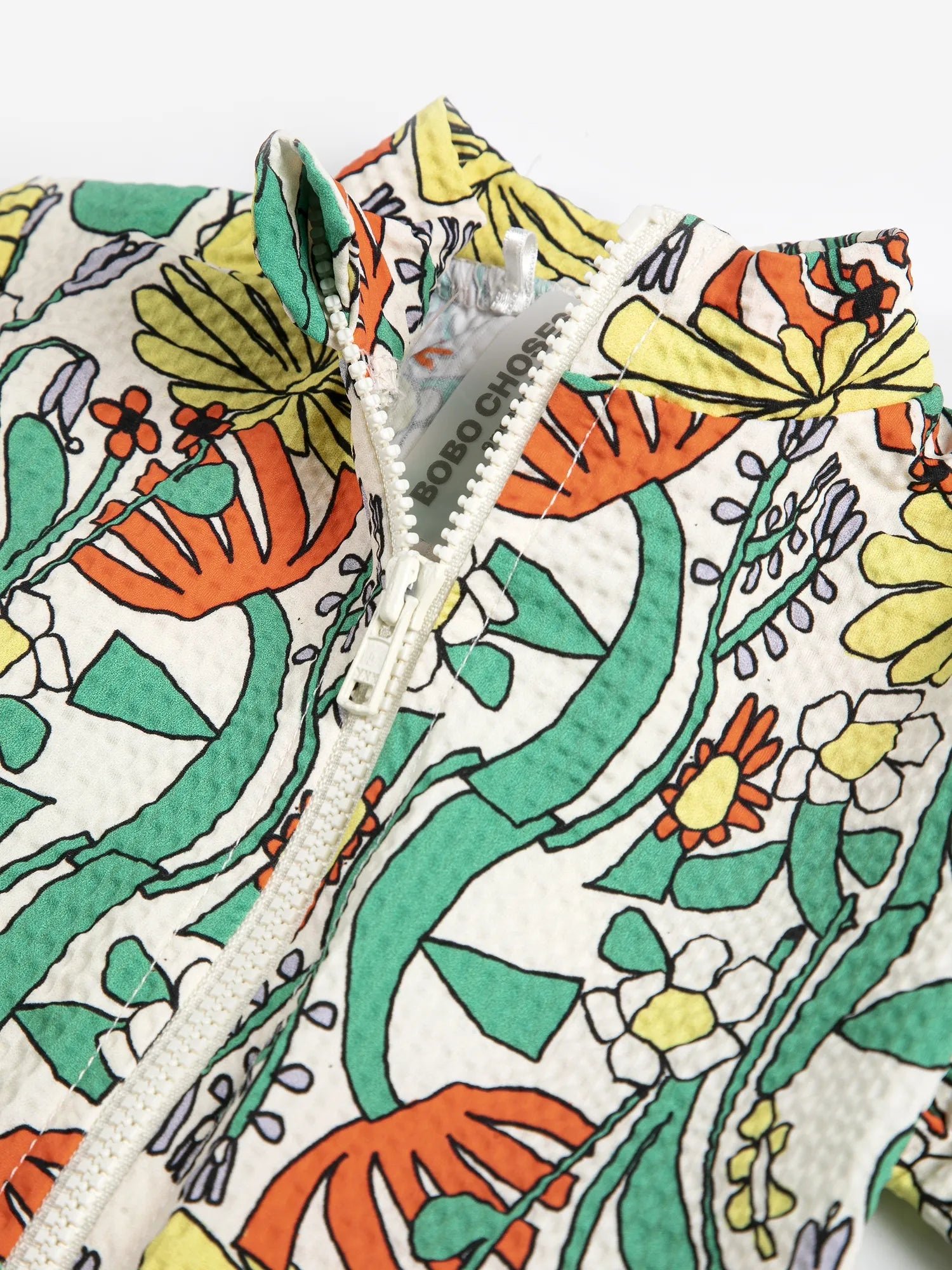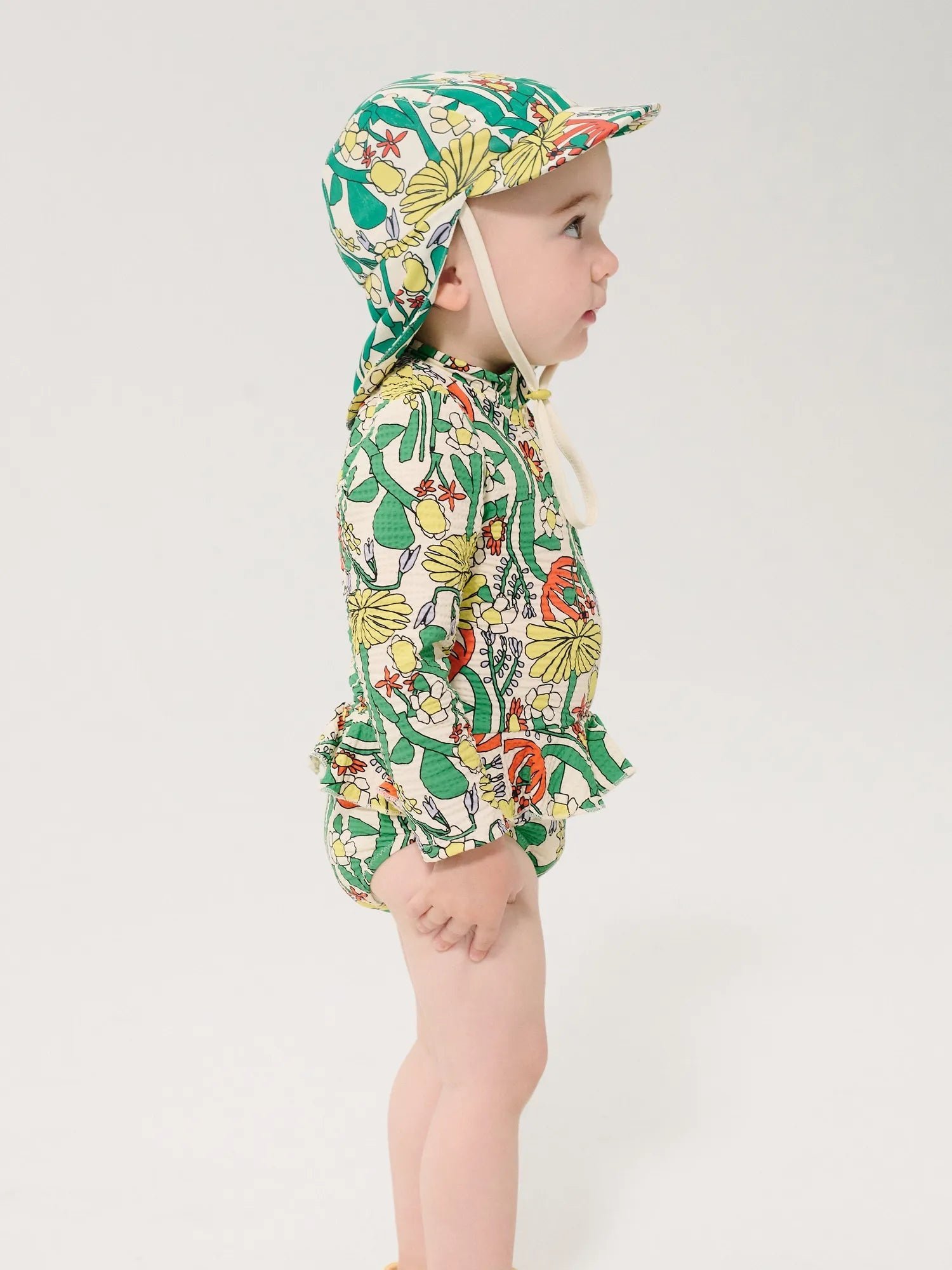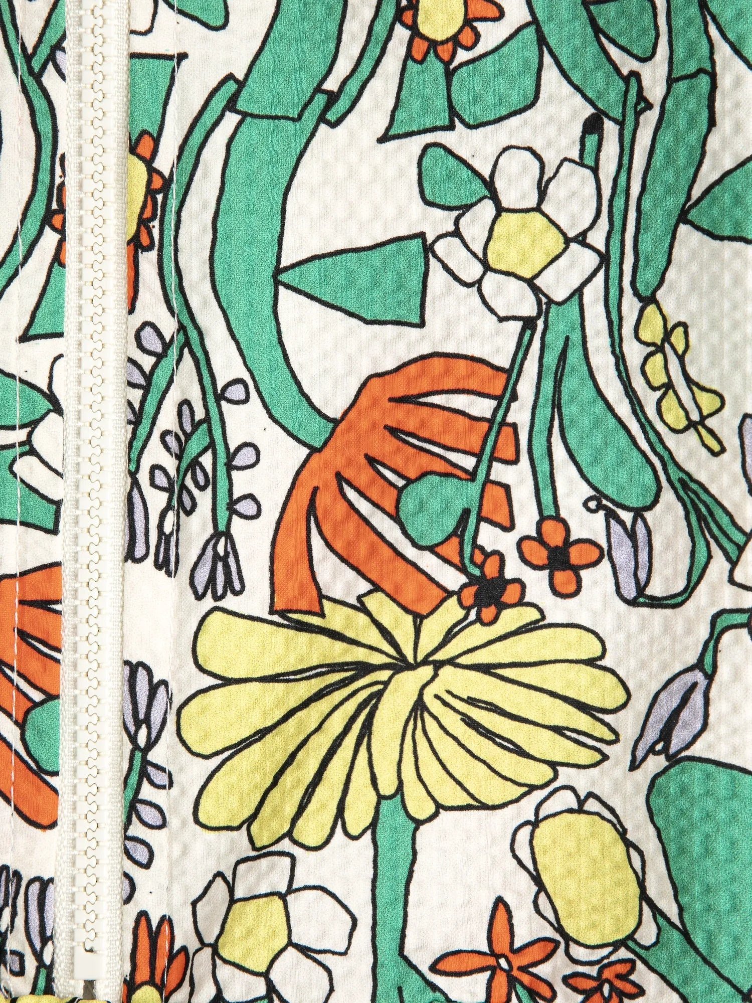 Mehrfarbiger Badeanzug. Mit langen Ärmeln, Reißverschluss, schmaler Passform, hohem Kragen, Rüschen und Sonnenschutz. Hergestellt in Spanien.