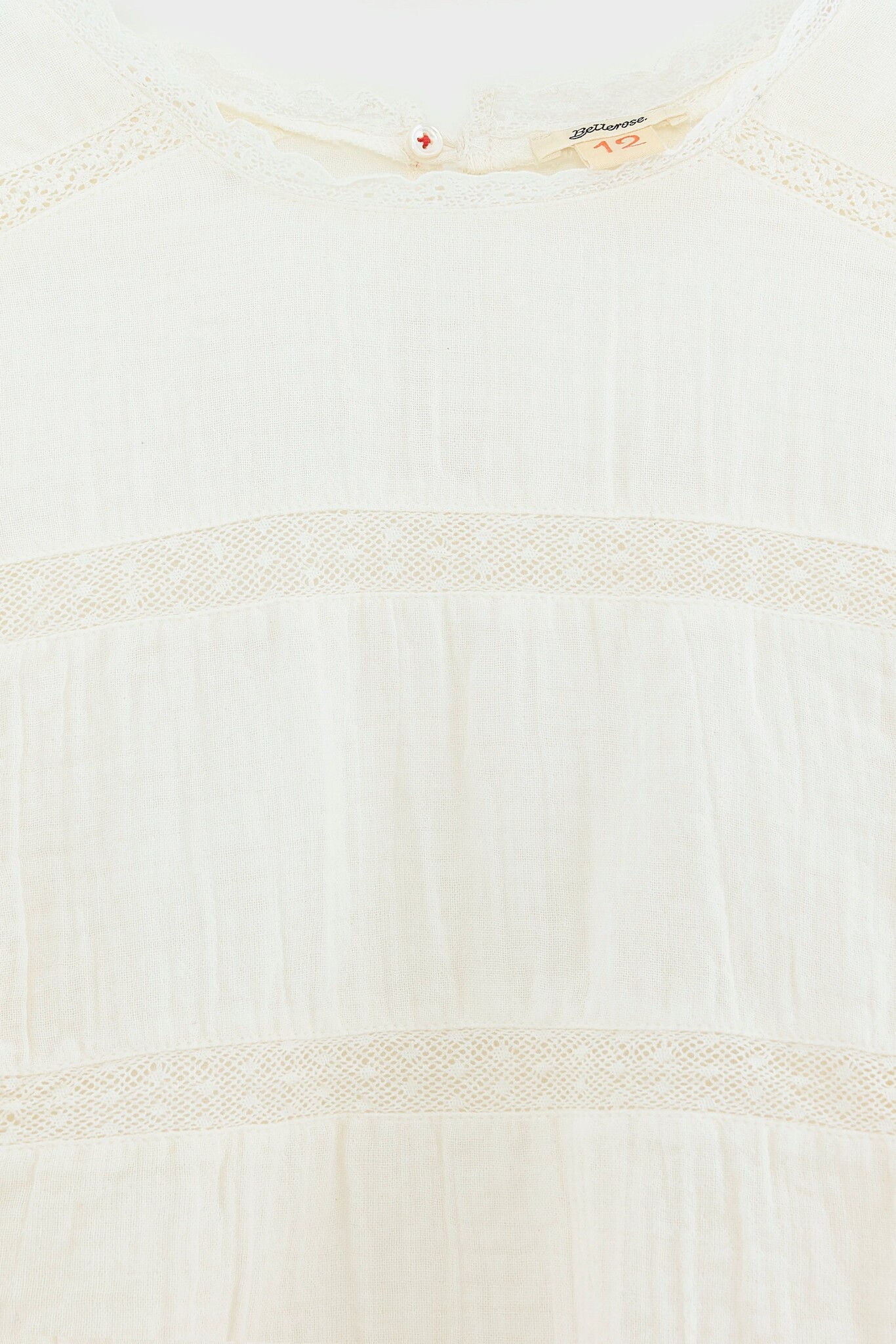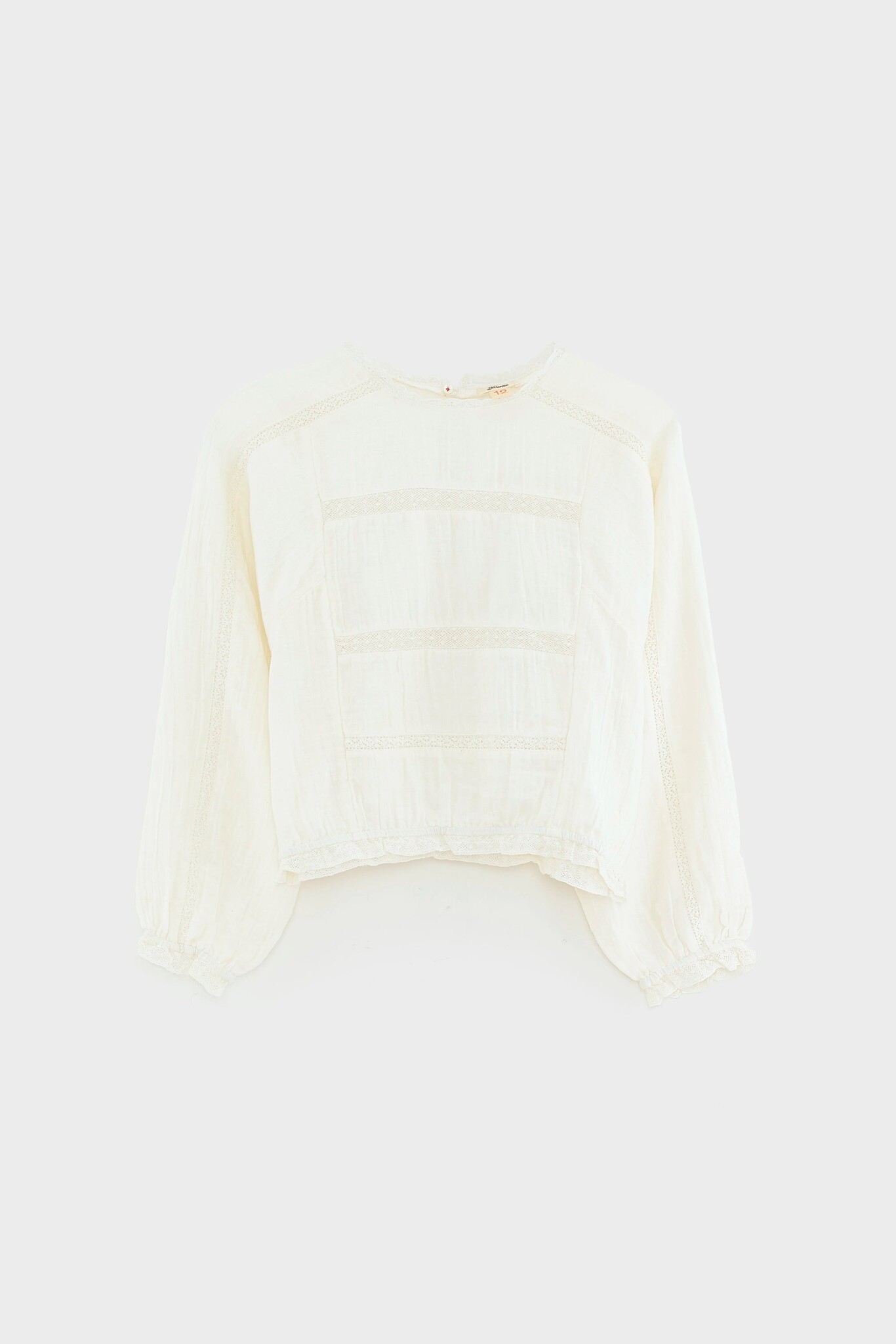 Vintage-inspirierte, ecrufarbene, kurz geschnittene Bluse mit aufwendigen Spitzendetails, weiten Ärmeln und einem weichen, strukturierten Stoff.