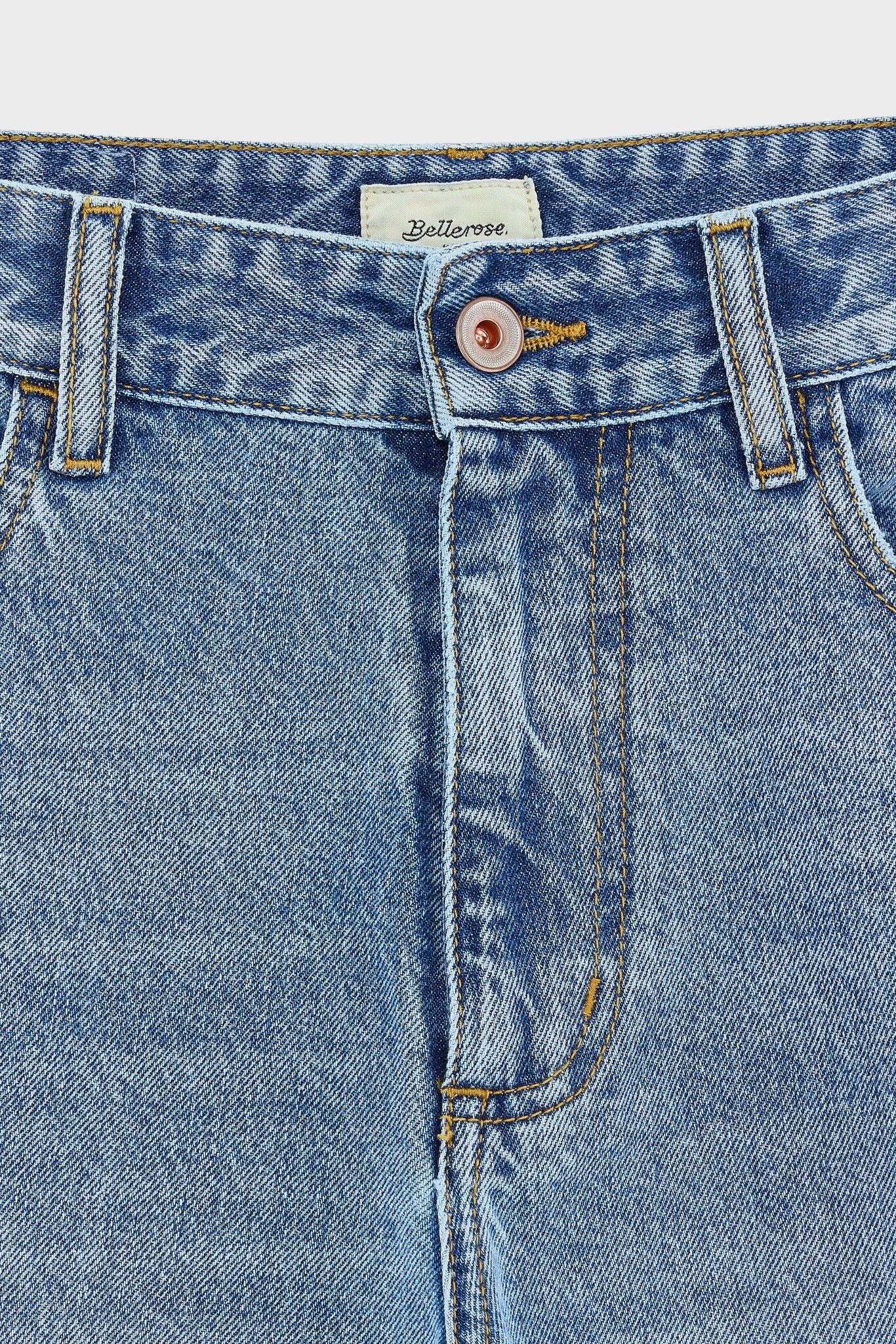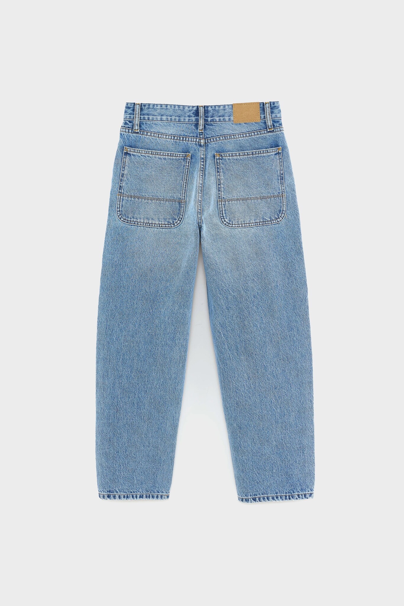 Klassische dunkelblaue Jeans mit lockerer Passform, Kontrastnähten und leicht konisch zulaufenden Beinen.