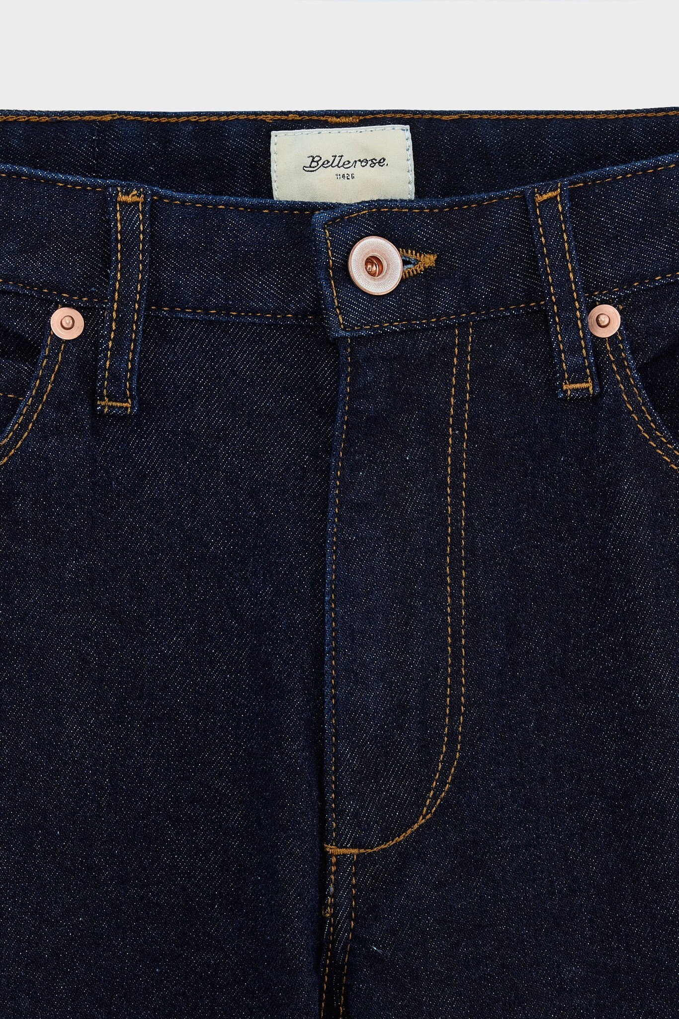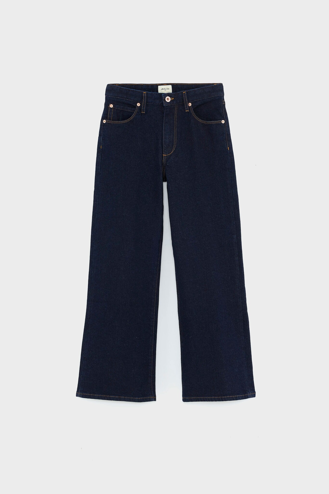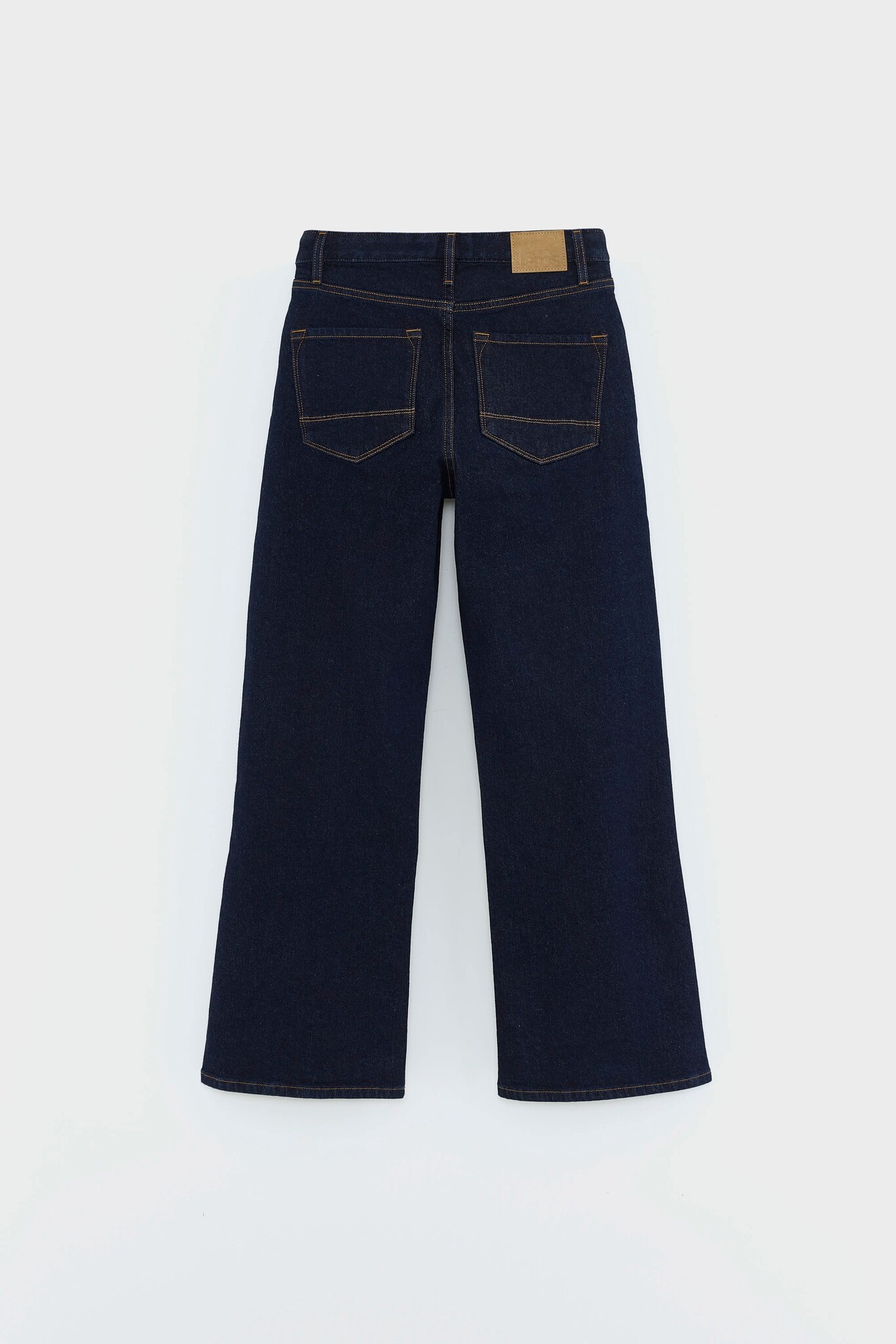 Hoch geschnittene Jeans mit ausgestelltem Bein aus blauem Stone-Washed-Baumwolldenim.