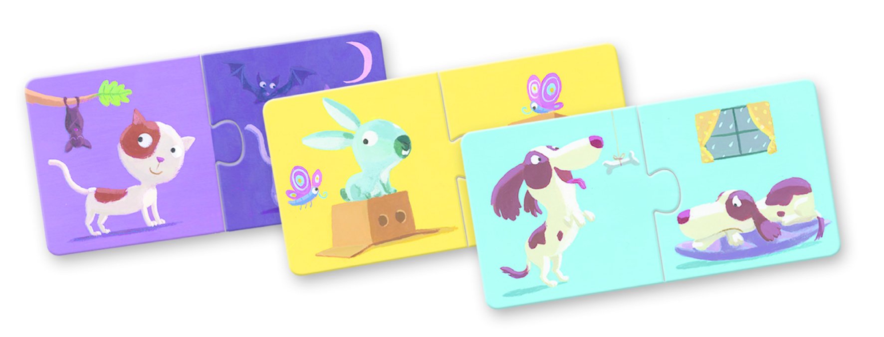 Das liebevoll gestaltete Puzzle Duo von Djeco ist für Kinder ab 2 Jahren eine gute Wahl. Auf wunderbare Weise werden bei den 12 Puzzles aus jeweils 2 Teilen Spielen und Lernen verbunden. Oben und unten, Tag und Nacht - gleichfarbige Puzzleteile mit gegenteiligen Motiven gehören zusammen. Da können allerlei hübsche Bilder gepuzzelt werden.