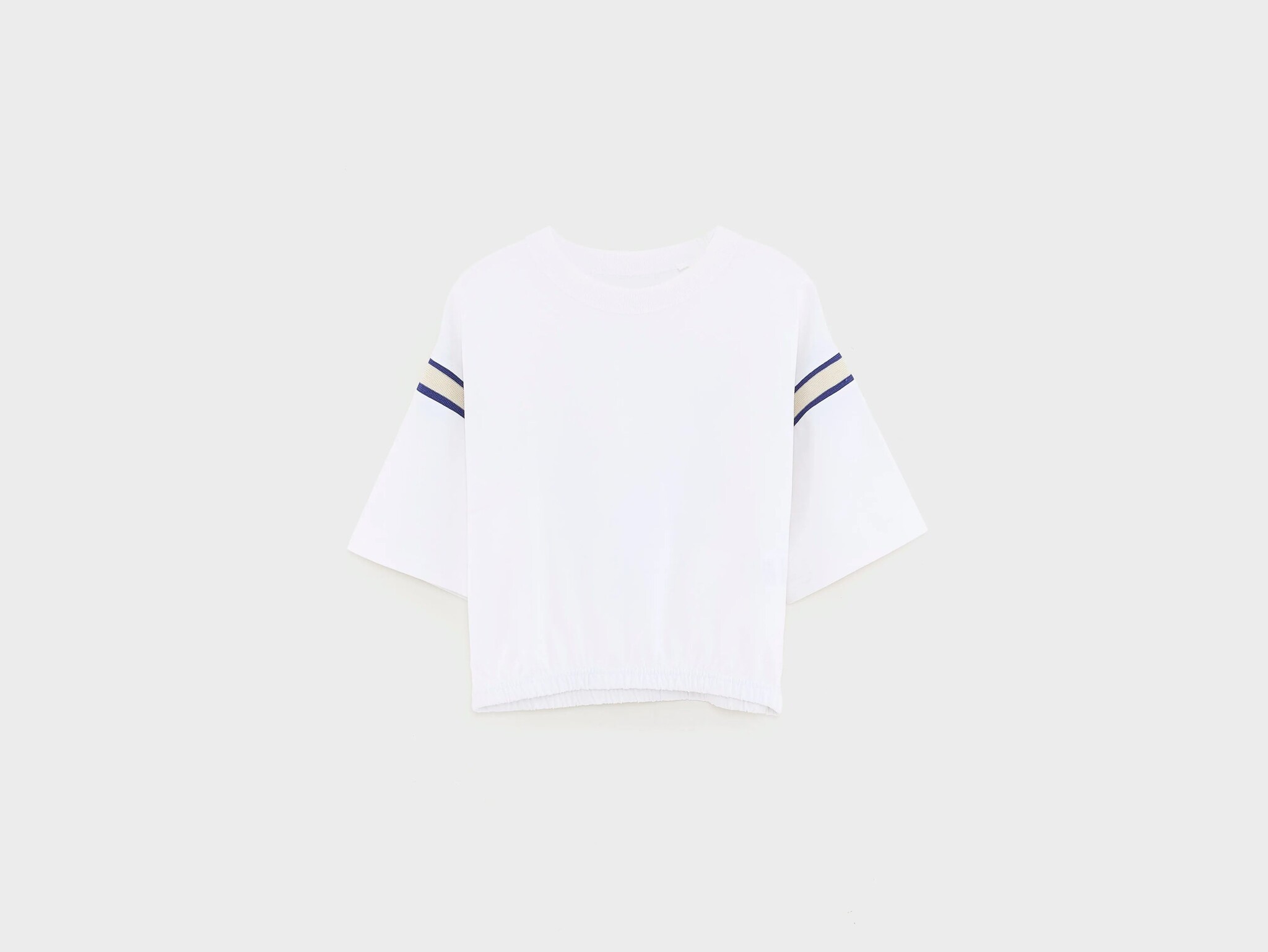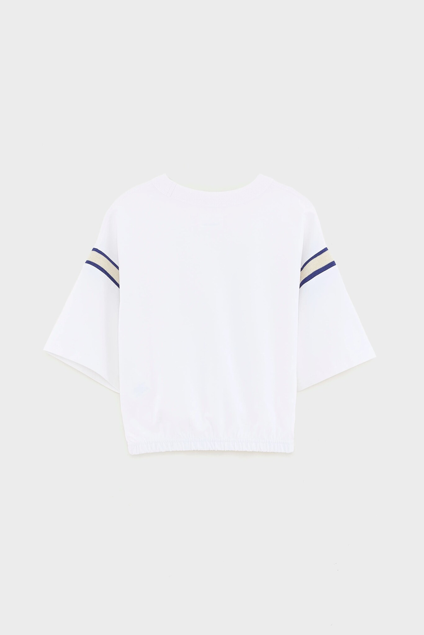 - Korte wijde mouwen met contrasterende marineblauwe en beige strepen