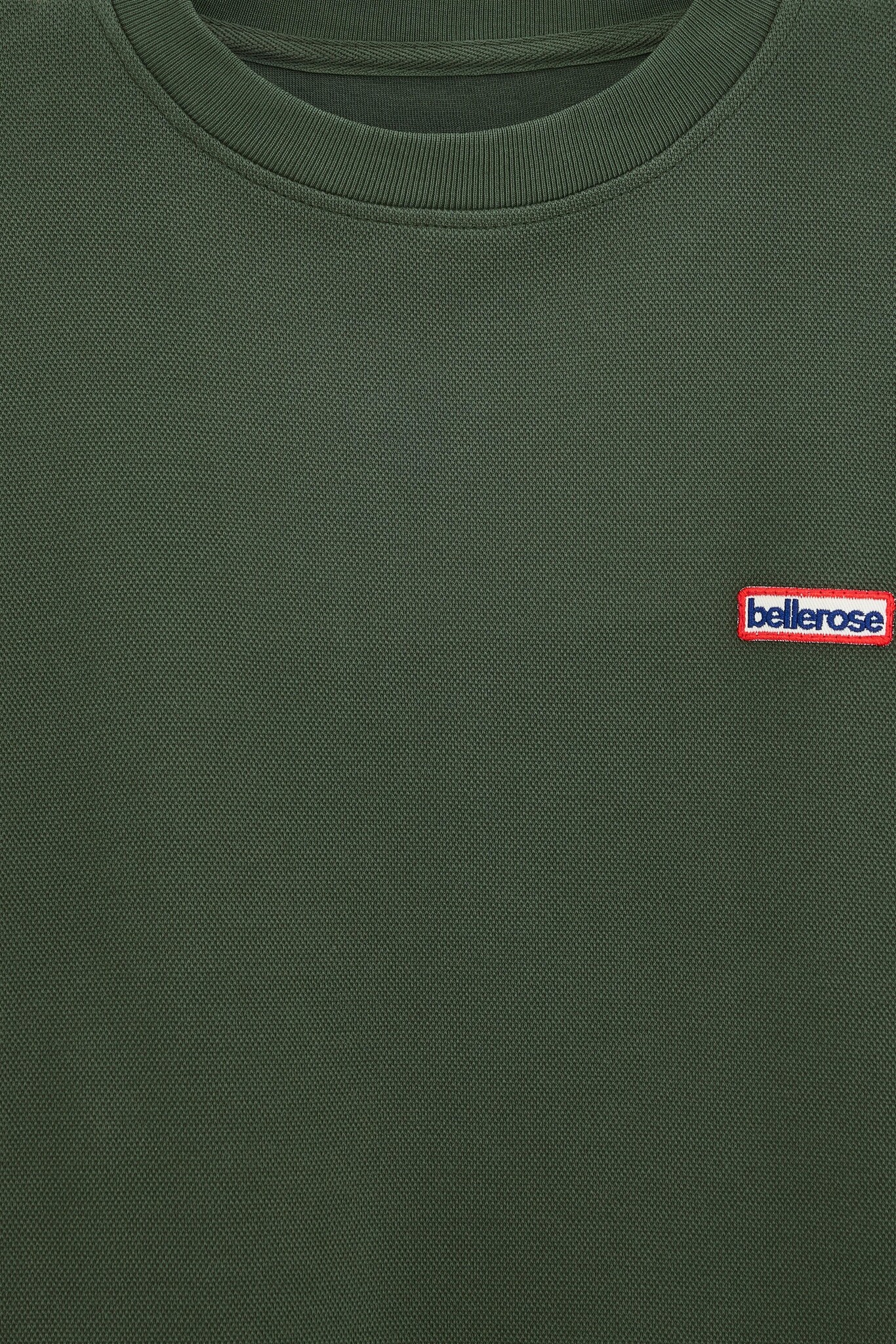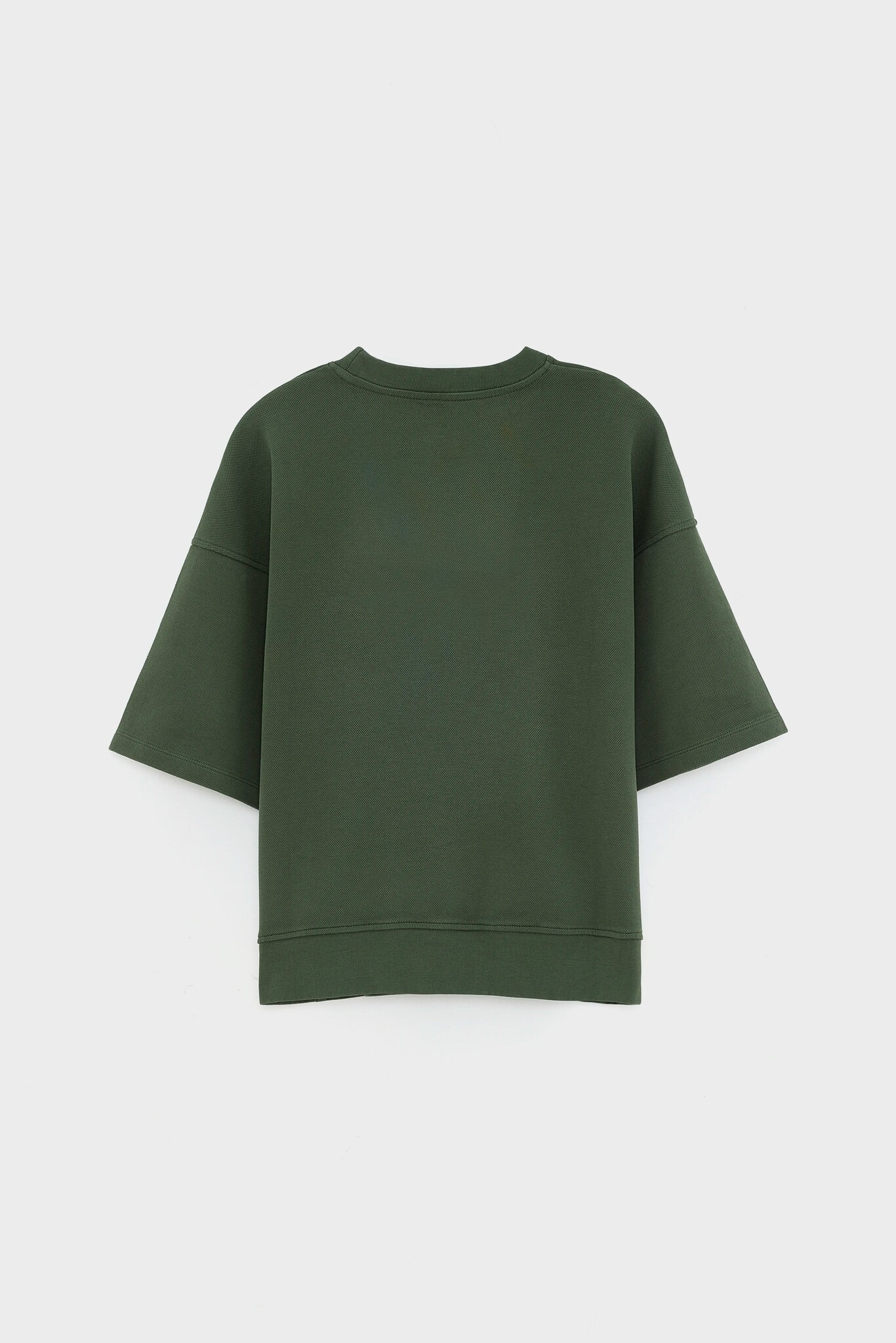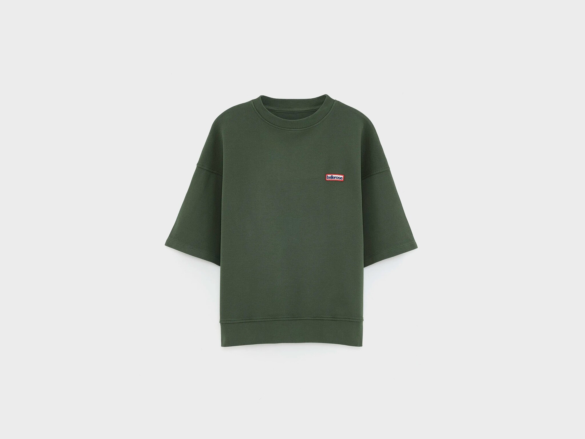 Relaxed T-shirt met korte mouwen in donkergroen, ontworpen met een ronde hals, verlaagde schouders en een kleine logopatch op de borst.