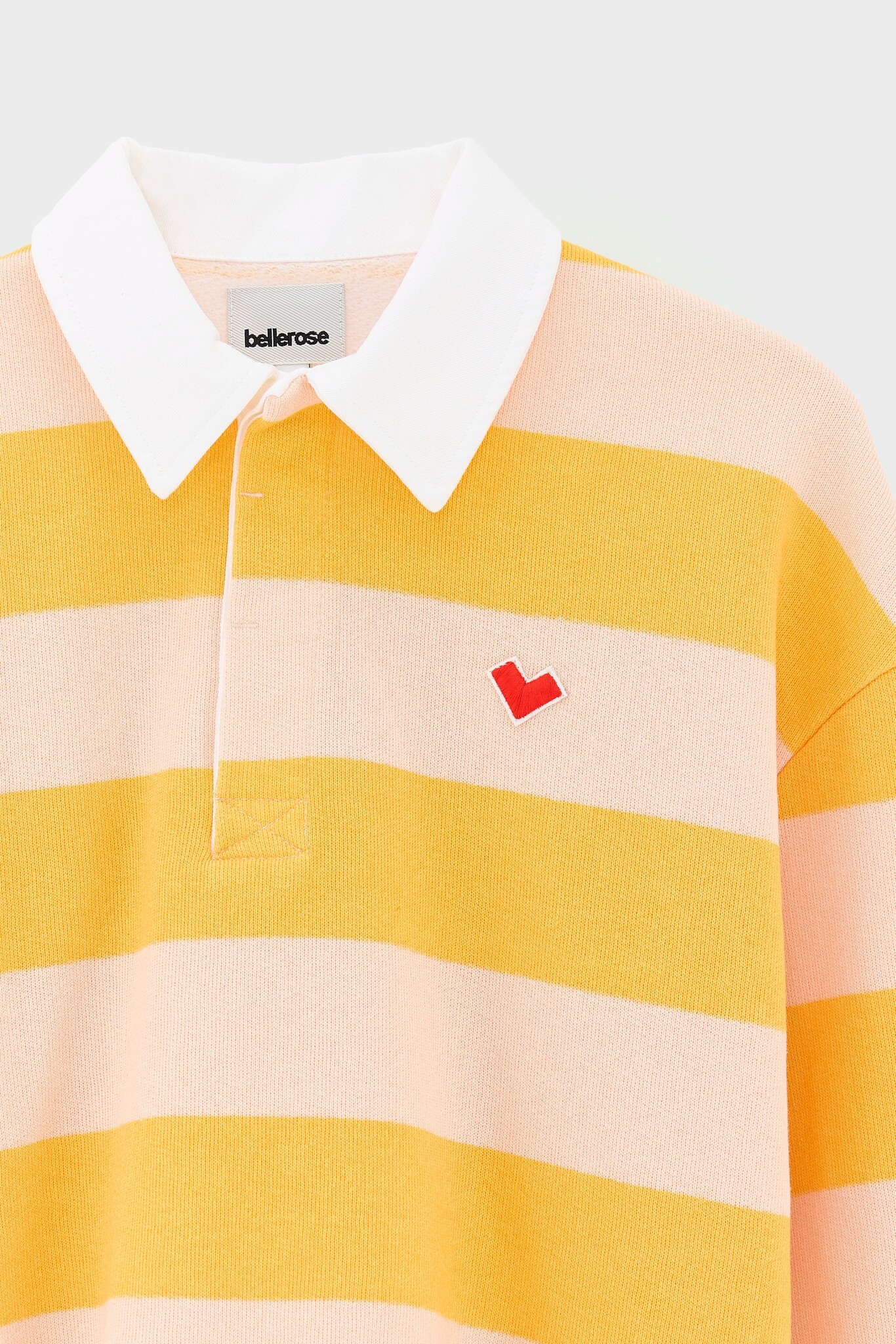 Gestreept poloshirt met contrasterende witte geweven kraag, lange mouwen en opvallende horizontale strepen in afwisselend pastelroze en levendig geel.