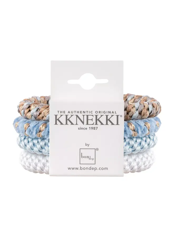 De originele Kknekki wordt erkend als een van de beste hairties ter wereld. De unieke weeftechniek maakt ze extreem zacht voor elk soort haar en ze zullen niet vervagen, rafelen of verslappen, zelfs niet als ze in zout water worden gedragen. Ze zijn ook allergievriendelijk. De unieke handwerk- en weeftechniek met meer dan 60 draden heeft ons bijna oneindig veel kleur- en combinatiemogelijkheden gegeven.